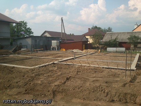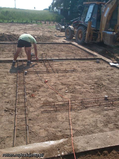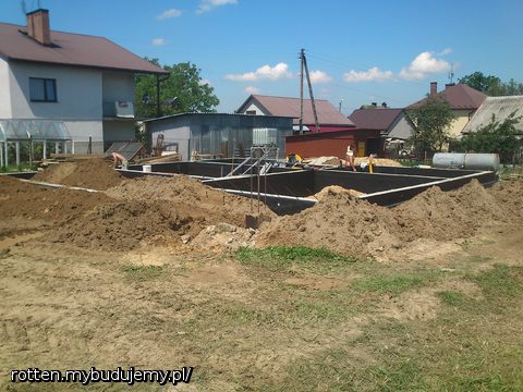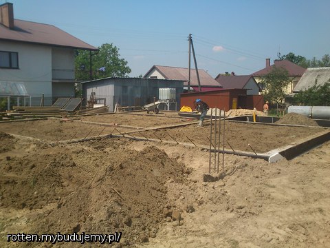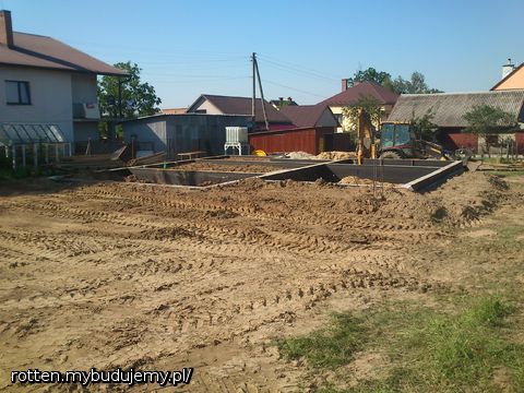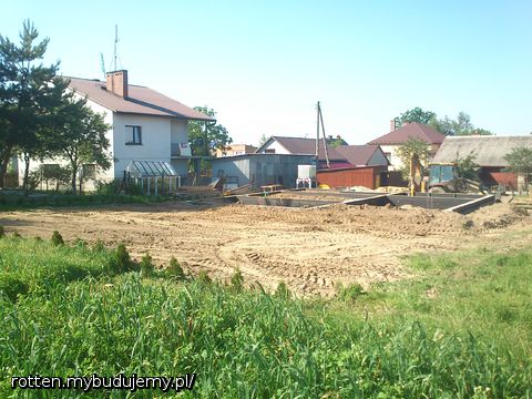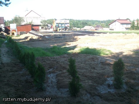 Dzisiaj w upale wykonany drenaż, kanalizacja i na koniec kopareczka obsypała fundamenty ziemią. Jutro od rana piach do środka zbrojenie pod ścianki działowe i po południu jak dobrze pójdzie slepa wylewka
