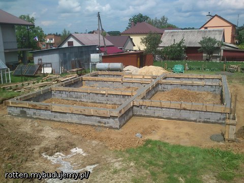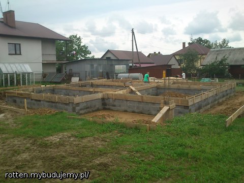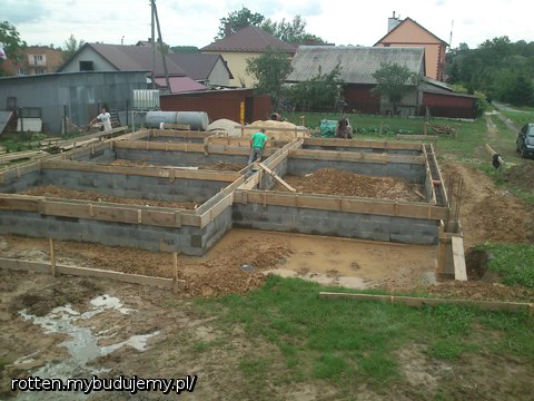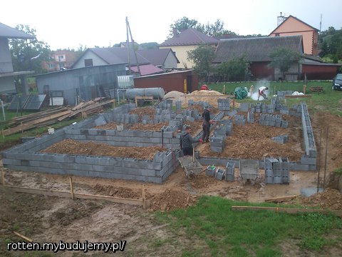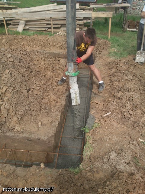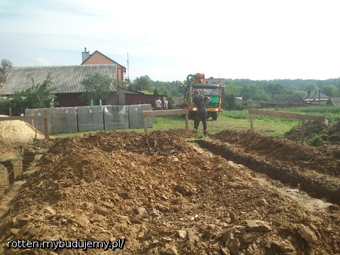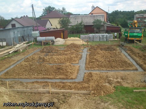 W sumie 3 gruszki przywiozły 25 kubików. Ławy kopane 60 cm w dół i 50 na szerokość + filar 1mX1m pomieściły 23 m3, 2 kubiki zwrócone ;). Na koniec znieśliśmy część pustakó szalunkowych na środek i "fajrant" wybił o godz 13.00