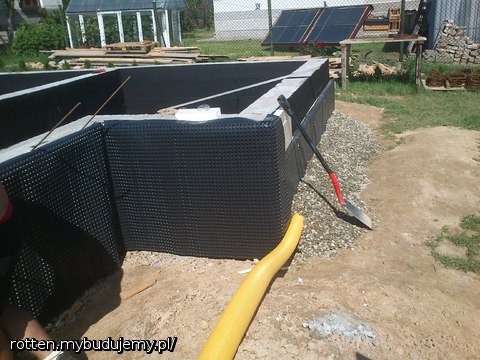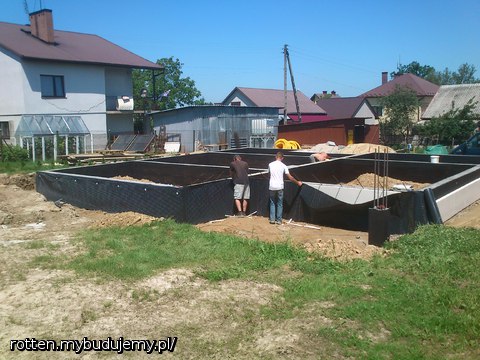 Dzisiaj pomalowany fundament na czarno + położony styrodur + folia kubełkowa na połowie budynku. Całość wygląda ładnie i w myślach widać już czubek dachu...