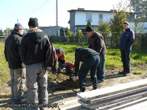 Wcześnie rano w sobotę pojechaliśmy na budowę. Trzeba było wykopać 23 dziury na słupki ogrodzeniowe. Wykonawca pożyczył nam cud - maszynę spalinową do wiercenia tych dziurek. Pożyczył też betoniarkę, przywiózł cement. Reszta była na budowie. Super. Przywieźli i ... kłopot z odpaleniem tego cuda. Ale wreszcie zaskoczyło. Komisyjnie wiercony był pierwszy dołek.