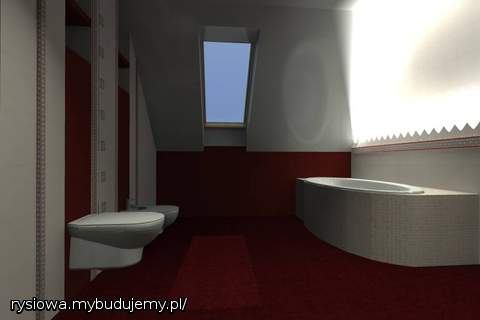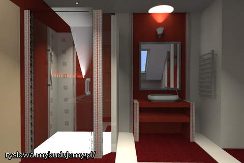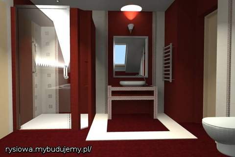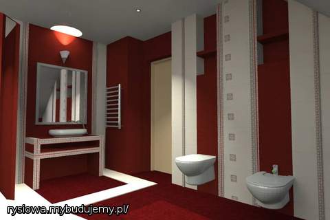 Dostałam maila z projektem. Mam jeszcze drobne zmiany, ale chyba jest OK. Nie sugerujcie się kolorem bordowym, płytki są BRĄZOWE (pokazywałam je już). Widzi mi się ścianka pod oknem jasna z paskiem dekorem na styku ze ścianką kolankową, a ściana nad wanną ciemna.