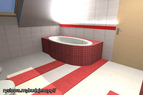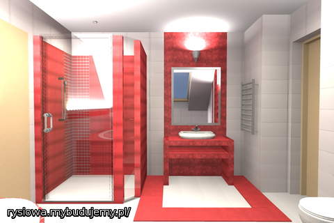 Bardzo ładna łazienka :), odważna :))) Podłoga jest ok choć na jasnym bardziej widać kurz więc troszku więcej czerwonego nie zawadzi. Ściany mi osobiście się podobają, ta wizualizacja jest taka wyważona. Ale jeśli Ty wolisz mieć dominujący czerwony co szkodzi zrobić taką wizualizację ? A masz już wybrane jakieś konkretne płytki w tym kolorze?