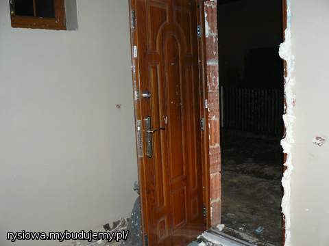 Brama przyjechała, a jakże, zaczęli ją montować i okazało się, że Pan źle sobie wymierzył i jest za niska o 10 cm. Więc zapakowali ją spowrotem, zabili znowi otworek OSB i jest jak było. Ta dobra ma być pod koniec przyszłego tygodnia. Tynki skończą pewno dopiero jutro, także instalacje od poniedziałku. Krzyży nie ma, ale hamulców w oknach też nie, więc jeszcze nie płacę za okna. Drzwi z garażu na ogród zamontowane. I czas na zdjątka :