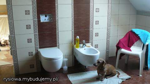 Wziął sobie dwa dni urlopu i pojechał na budowę. Fugował łazienkę. Prawie udało Mu się doprowadzić do zamontowania baterii w prysznicu (fugowanie jeszcze nie gotowe na 100%, bardzo dużo u nas jest tego). W łazience jeszcze ciągle kupa roboty. Zostały jeszcze do wykafelkowania półeczki nad geberitami. Wanna czeka na położenie mozaiki i na swój teakowy dekielek (być może jutro stolarz da radę zjawić się i przygotować szablon tego dekielka). Potem już zostałyby same duperelki : zamontowanie lustra, kontaktów, kinkietów i reszty oświetlenia. Ściany w sypialniach wymagają jeszcze dogładzenia, przedpokój u góry też czeka na swoją kolej. Dopiero potem podłogi i można będzie zejść na dół. Bardzo bym już chciała...