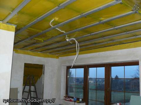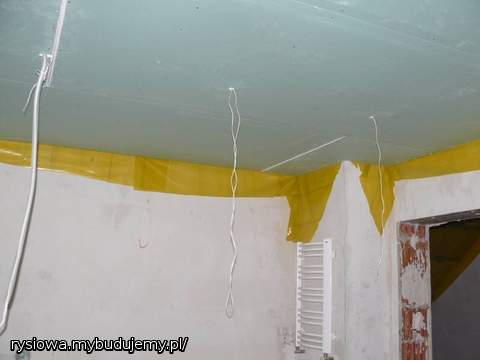 . Chłopcy działają na górze z sufitami podwieszanymi. Wykończyli ocieplenie koło drugiej skrzyneczki z zaworem gazowym
