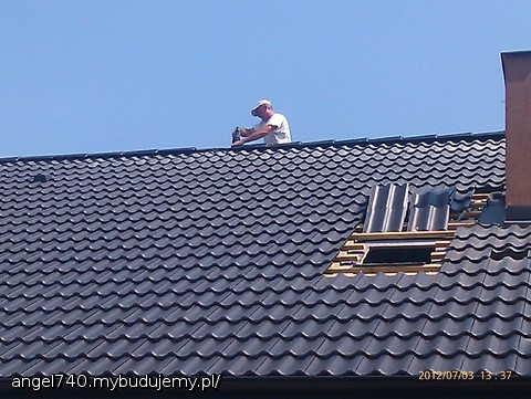 Pogoda dzisiaj urządziła prawdziwy sprawdzian naszy pracownikom od układania dachówki - najpierw słońce piekło, a potem zaczeł padać.Ale jutro już będą z rana wstawiać okna dachowe i będzie naprawdę pięknie.Już nie możemy doczekać "TEJ KROPKI NAD i "