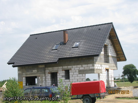Tak dzisiaj już możemy powiedzieć że mamy swój dach nad głową.Pięknie zainstalowane okna są, tylko zakurzona dachówka ale teraz na wieczór popadało i myślie że jutro będę lepiej wyglądać nas domek po kąpieli.Jesteśmy zadowoleni że mieliśmy jak do tej pory dobrych fachowców.Teraz czekamy na okna.