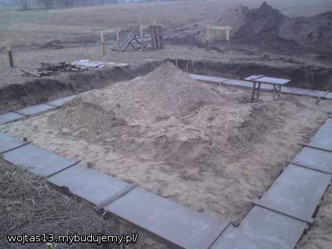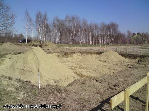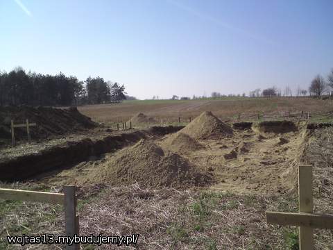 Wreszcie po zimie zaczęło się coś dziać na działce. Pierwszego kwietnia geodeta wytyczył nam budynek. Majster z ekipy nie mógł się doczekać tego faktu i już w Wielką Sobotę poszedł przenosić wymiary pod wykop. Także na dniach czekają nas roboty ziemne. Musiałem też wystąpić o zasilanie placu budowy do energetyki, miesiąc czekałem na warunki. Ale cieszy mnie fakt rozpoczęcia budowy
