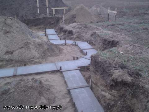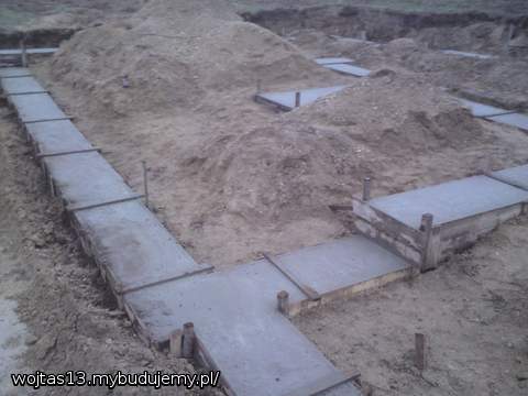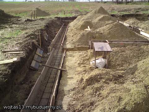 W środę czyli 14. kwietnia wykonawca wylał ławy fundamentowe. Poszło w nie 17m3 betonu i trwało niecałe 5 godzin. Dobrze, że nie padał zbyt mocny deszcz, bo obawiałem się, że gruszka z betonem ugrzęźnie na działce. Niebawem nastepny etap czyli murowanie ścian fundamentowych. Jak widać na zdjęciach majster zdecydował o fundamencie schodkowym w porozumieniu z kierownikiem budowy ( różnica poziomów na działce ok. 1m) .