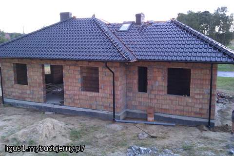Mamy już dach, dach jest czarny dachówka ceramiczna , okna będą prawdopodobnie w kolorze orzecha, elewacja biała. Zmieniliśmy wszystko, to jest: Zrezygnowaliśmy z garażu na rzecz dwóch dodatkowych pokoi, okienka w kotłowni wydłużyliśmy ( zamiast kotłowni mamy korytarz)