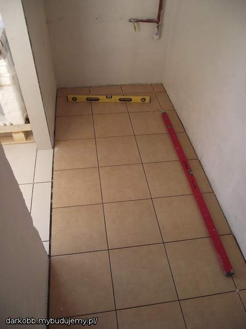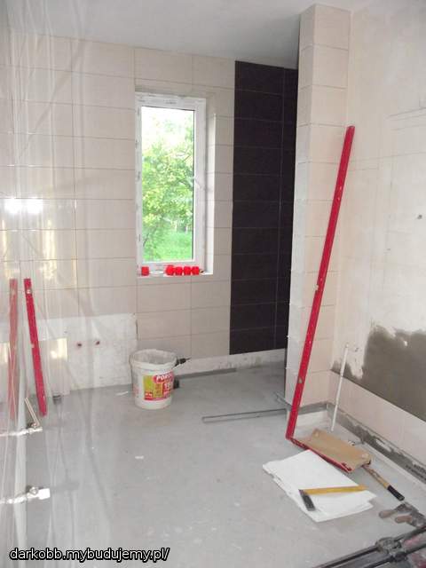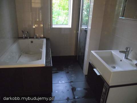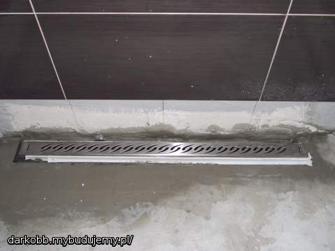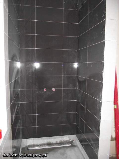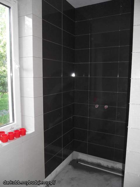 ...a w najbliższych dniach łazienka będzie wyłożona płytkami...zdjęcia już nieaktualne, ale mniej wiecej tak to bedzie wygladać...kabina prysznicowa wyłożona ciemnymi płytkami,  bez brodzika z odpływem liniowym...