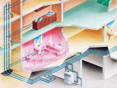 Jeśli podgrzewanie wody odbywa się przy zastosowaniu kotła dwufunkcyjnego lub zasobnika ciepłej wody użytkowej wówczas prowadzi się trzy przewody pionowe. Jednym przepływa woda zimna, drugi służy do rozprowadzenia wody ciepłej a trzeci, cyrkulacyjny, umożliwia stały przepływ ciepłej wody, co zapewnia natychmiastowa dostawę wody o żądanej temperaturze. W stosowanych do niedawna tradycyjnych rozwiązaniach instalacyjnych dopływ ciepłej wody poprzedzony był utratą kilku litrów wody chłodniejszej.
