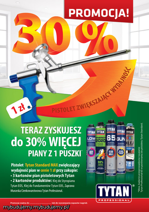Tylko teraz ten nowoczesny pistolet oferowany jest w cenie 1zł przy zakupie 3 kartonów pian Tytan lub 2 kartonów piano – klejów TYTAN.